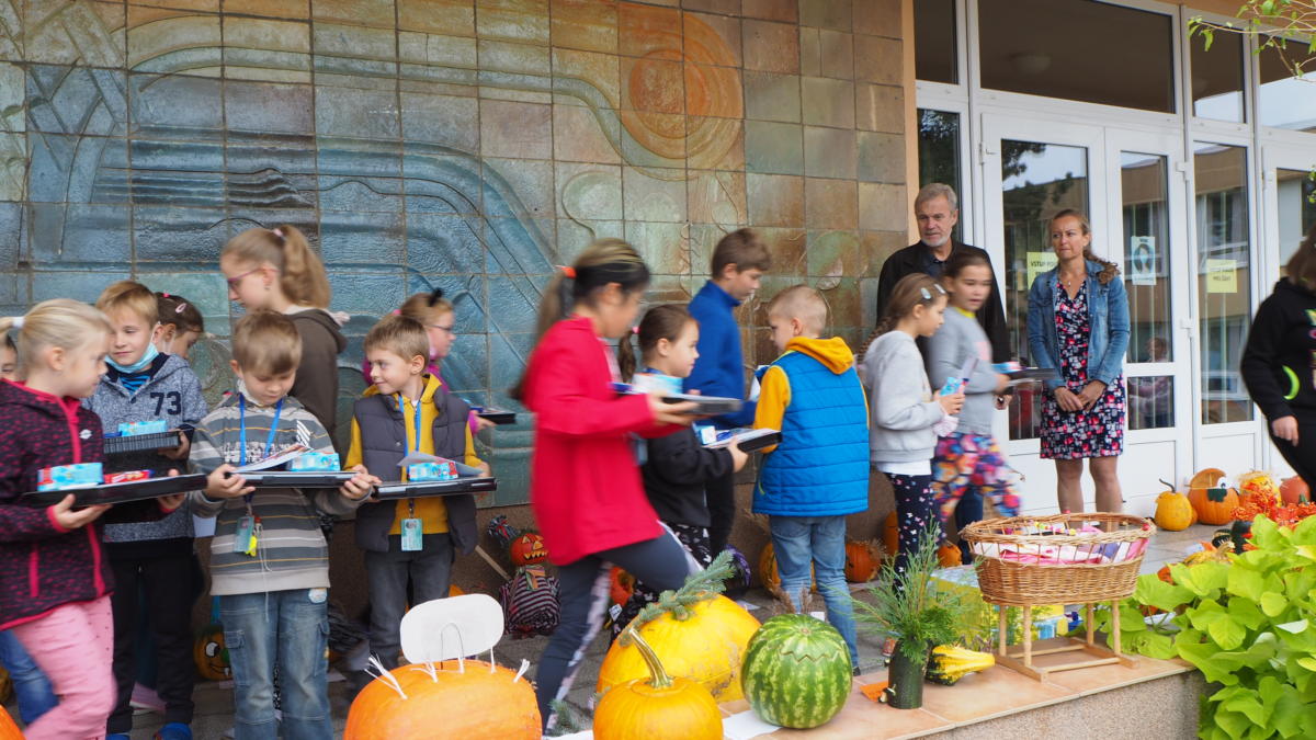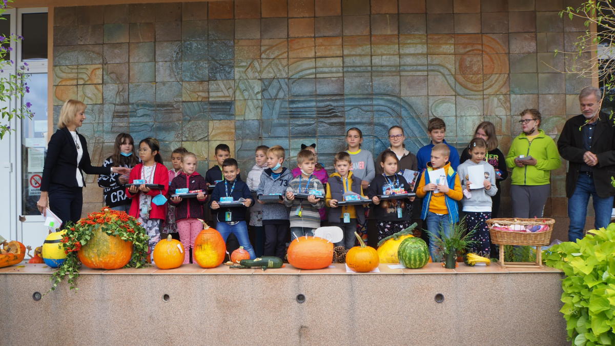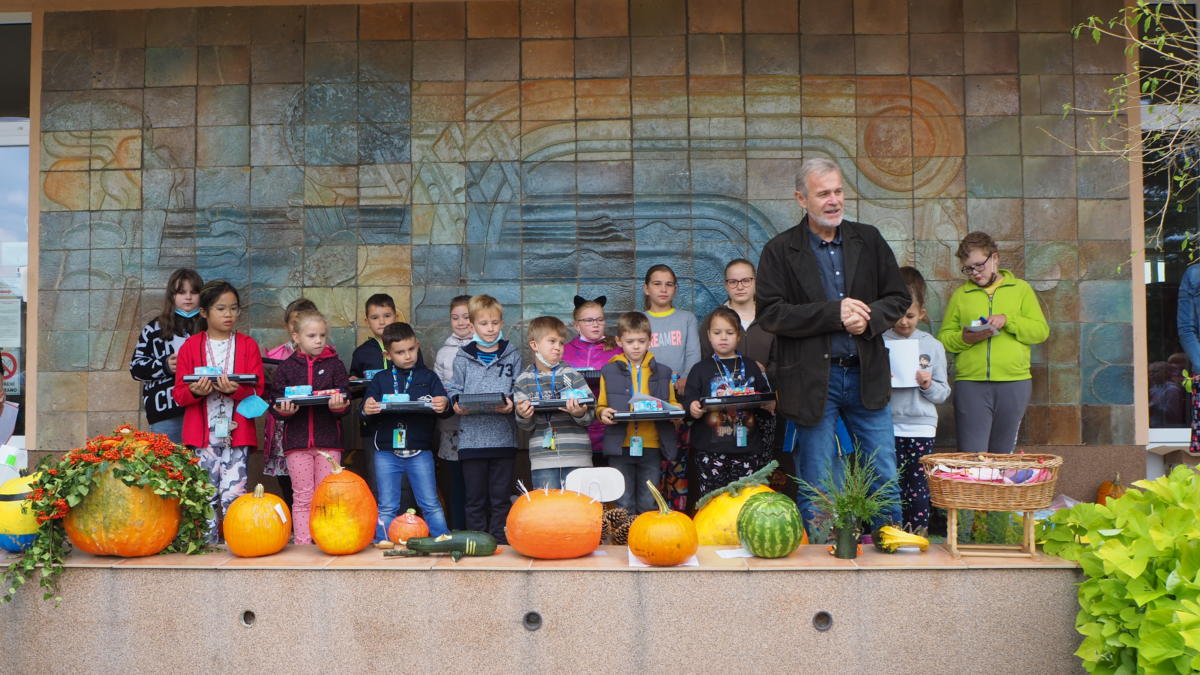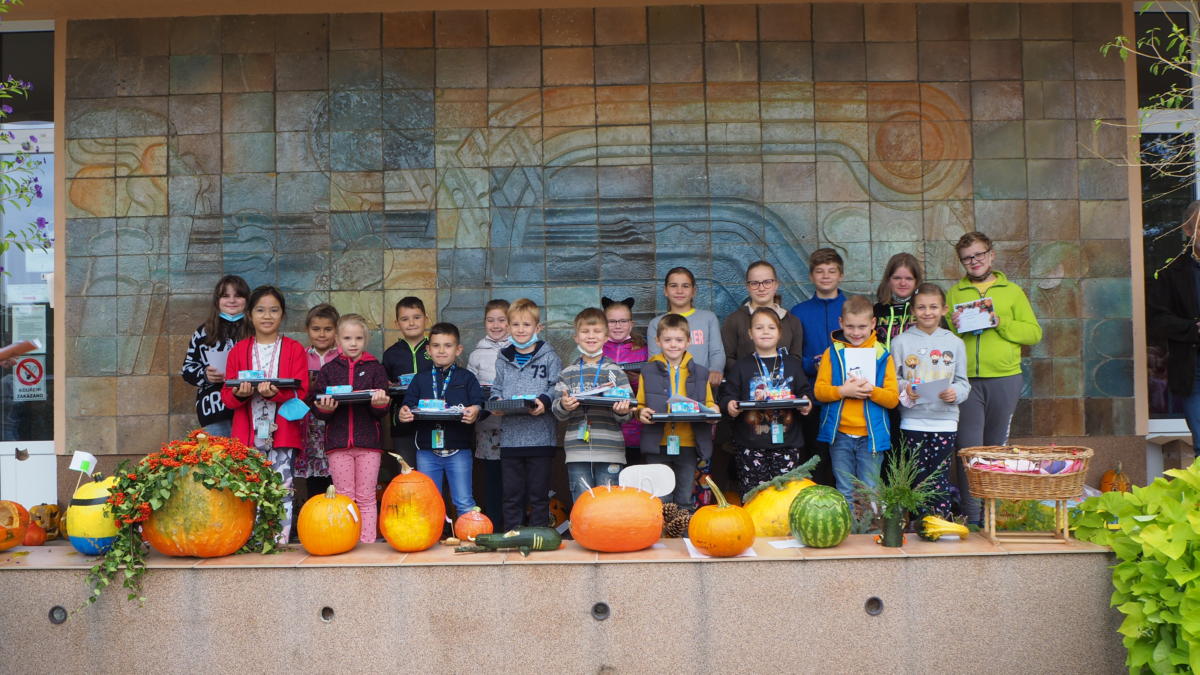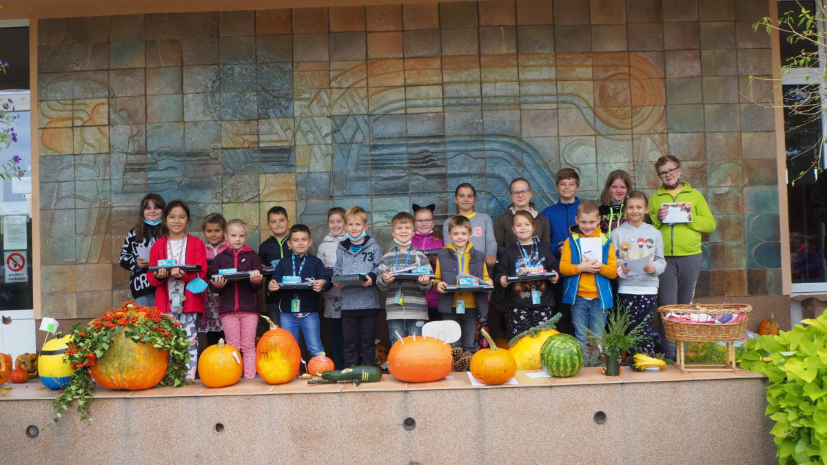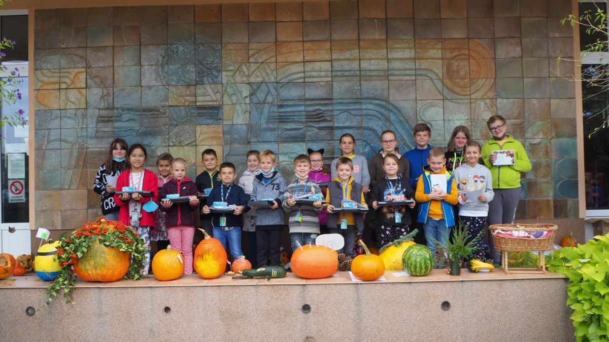 A jako už v loňském roce, i letos se nám opravdu urodilo. Celkově se soutěže zúčastnilo 117 žáků, samotných dýňových výrobků bylo mnohem více. Např. Dýňová rodinka Kamilky Tranové z V. B má 5 členů, Tržnice Emičky Trnkové z V. A má hned několik samostatných postaviček a Podsvinče dýňové Adama Jelínka má 2 krásná růžovoučká prasátka jako z pohádky. Některá strašidýlka máme oblečená a téměř celá zahalená, jako je např. figurka Tadeáše Matase z I. A nebo Spící miminko Sašky Blahynkové ze VI. C.