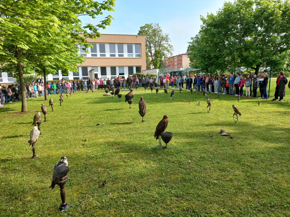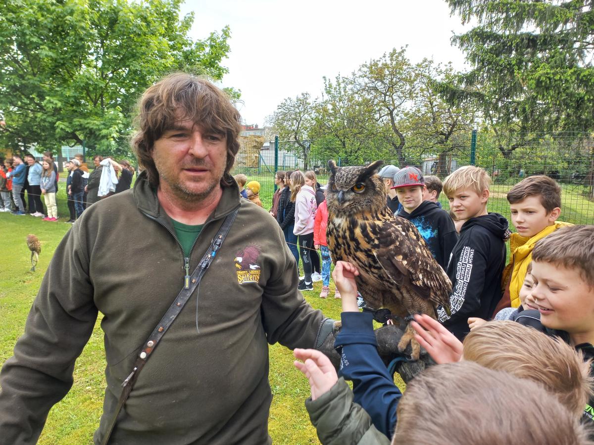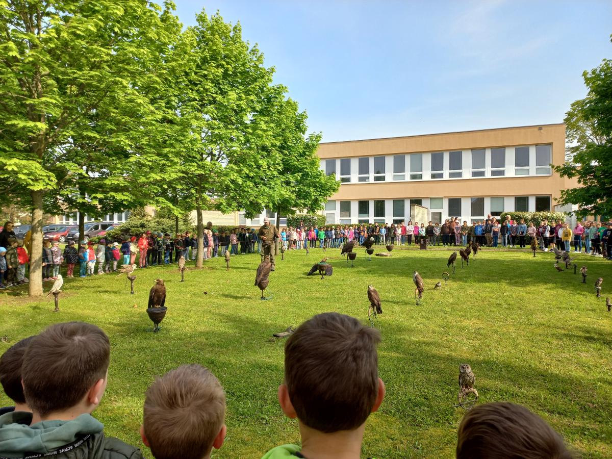 Jednoho slunečného májového rána bylo slyšet prapodivné zvuky z naší školní zahrady. Zavítalo k nám 45 dravců a sov. Luňák zakroužil a obratně chytal vyhozené kousky masa, výr velký lovil, orli a sovy přelétávali nad hlavami diváků. Zajímavý a velice zábavný výklad, aktivní zapojení našich žáků do výukového programu a pobyt na čerstvém vzduchu vykouzlil všem úsměv na tváři.