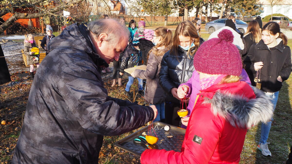 Slunečnice, lůj, semínka, zrníčka, jablíčka, ale i dvě zbrusu nová dřevěná krmítka. K tomu kupa dětí, co mají rády přírodu, a vánoční nálada. To všechno bylo k vidění i slyšení v úterý krátce po desáté hodině u našeho jezírka. Sešli se tam členové ekotýmu a zástupci z většiny tříd, aby nazdobili pro zvířátka, především pro ptáčky, tradiční vánoční stromeček v přírodě. Ozdoby vyrobili společně se svými spolužáky a že se jim to podařilo, vidíte na fotkách.